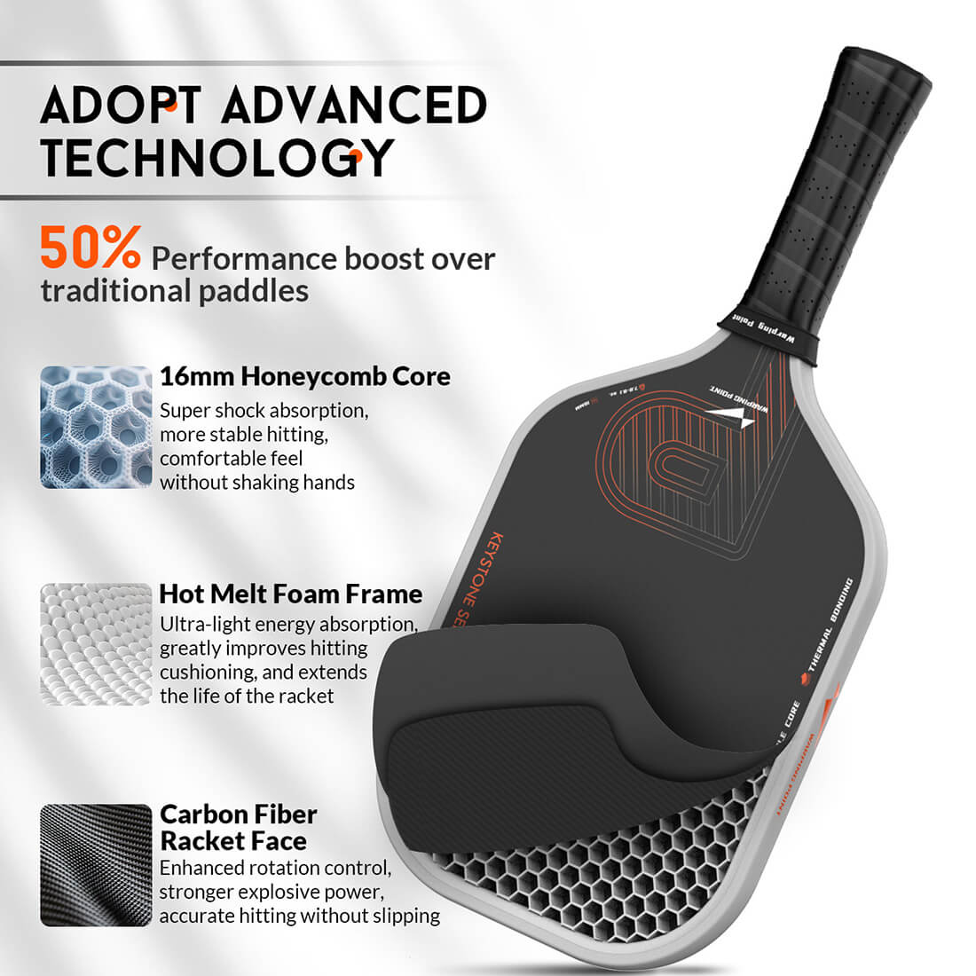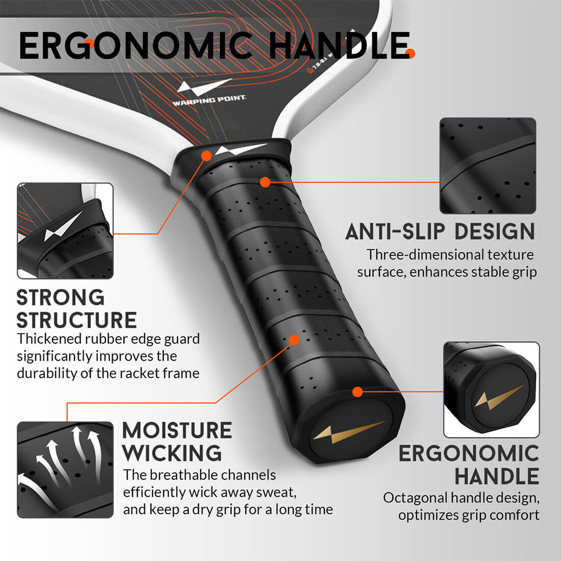 Featuring a 5.5-inch handle with a 4.25-inch circumference, pickleball paddle ergonomic grip fits naturally in your hand. Wrapped in 360° cushioned foam and sweat-absorbing material, it reduces fatigue and offers better control.