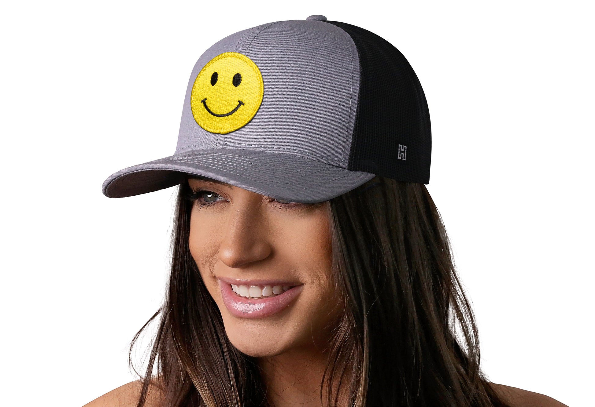 Represent happiness in style with the HAKA Smiley Face Trucker Hat, featuring a premium emoji embroidered patch on our gray-black signature 5.0 trucker.