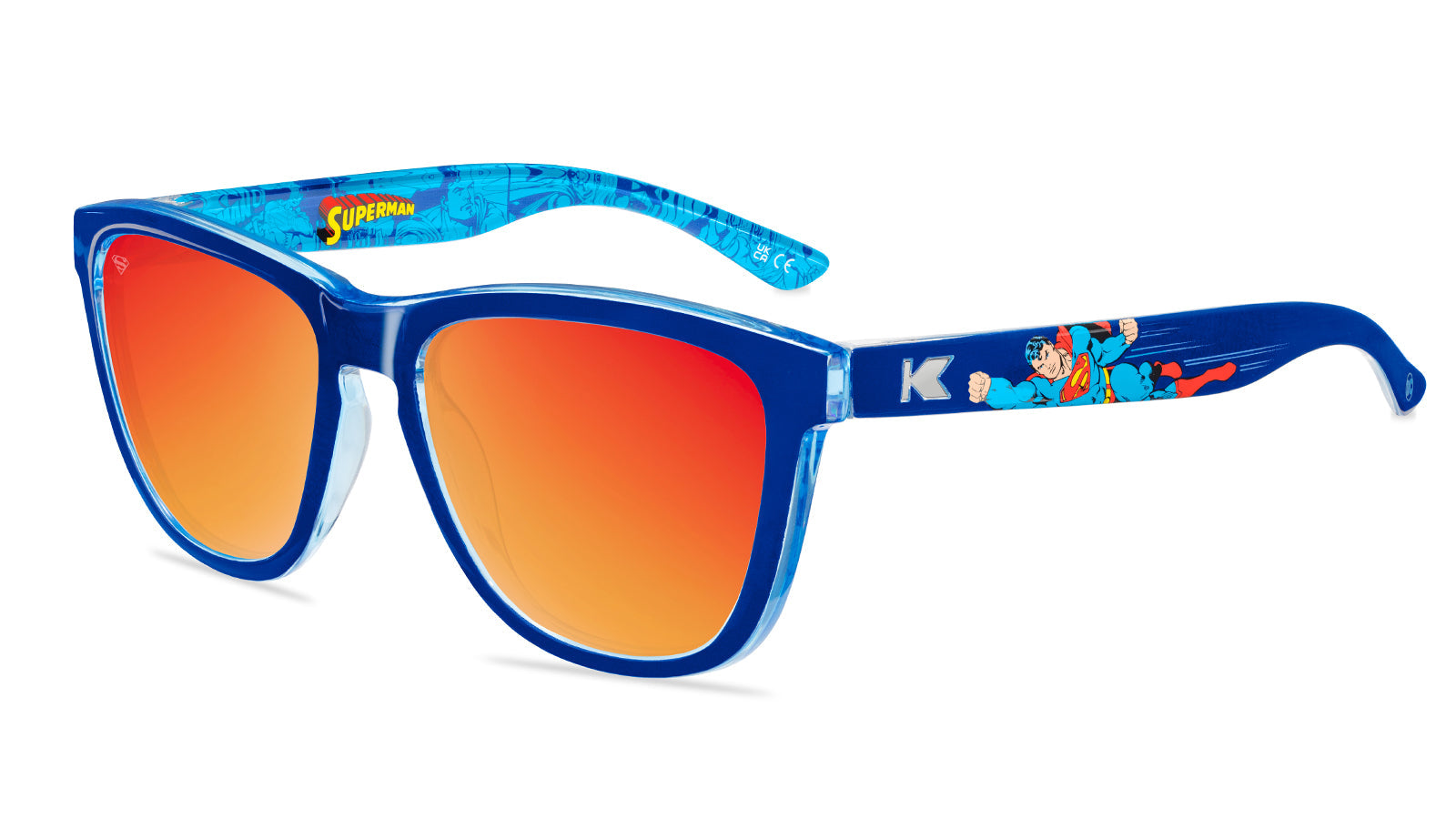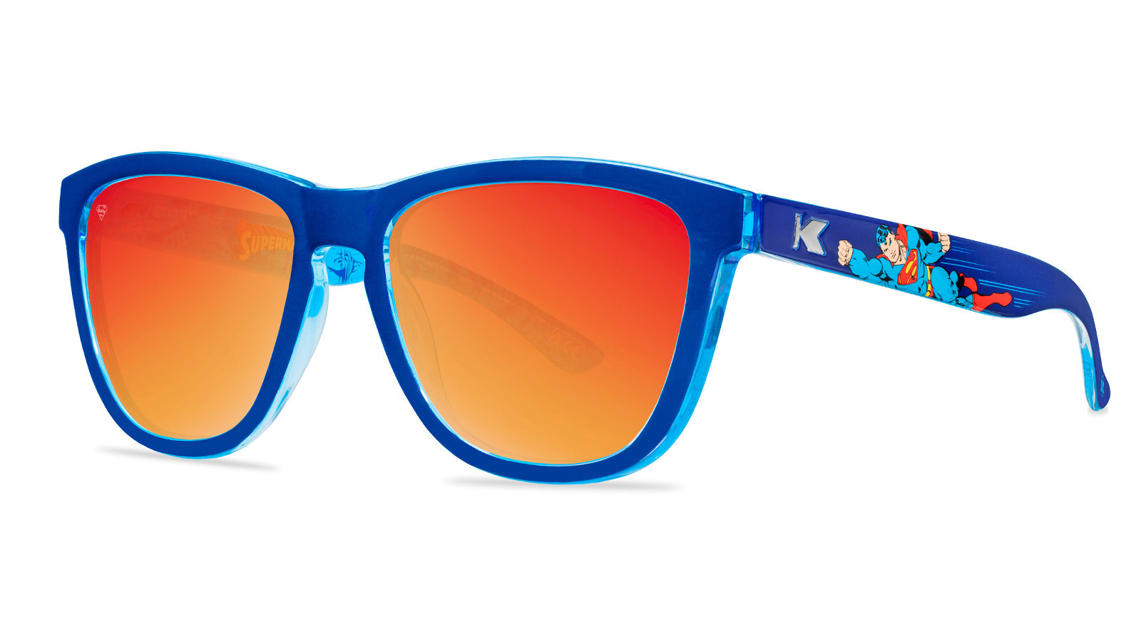 Heroic sunglasses built to honor the Last Son of Krypton just landed! These Superman Premiums feature fiery red sunset polarized lenses inspired by Superman’s iconic heat vision, silver steel K logos, and bold blue arms showcasing Superman himself in full heroic form. Inside the frames? A blast of classic comic book artwork straight from Metropolis. No kryptonite, just pure power. Whether you're leaping tall buildings or just blocking UV rays, these Premiums are ready to save your summer.